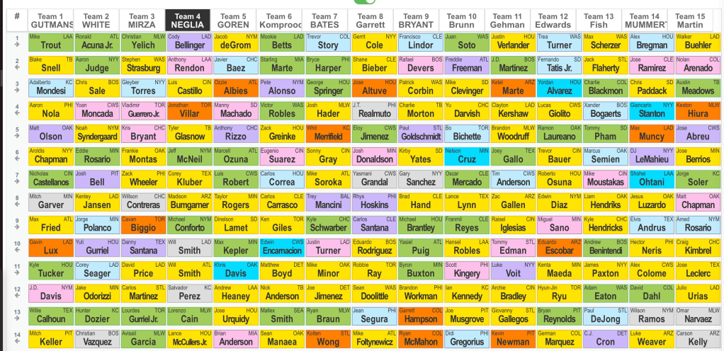 Round 7: Jesus Luzardo, I kinda love this pick. He was sort of slept on. I think he might be the best pitcher in Oakland. I could have taken Matt Olson or Paul Goldschmidt here, but I figure Clegg already has Bellinger, and Keaton isn’t going to take Goldy and Olson….WRONG!!! HE TAKES BOTH!!