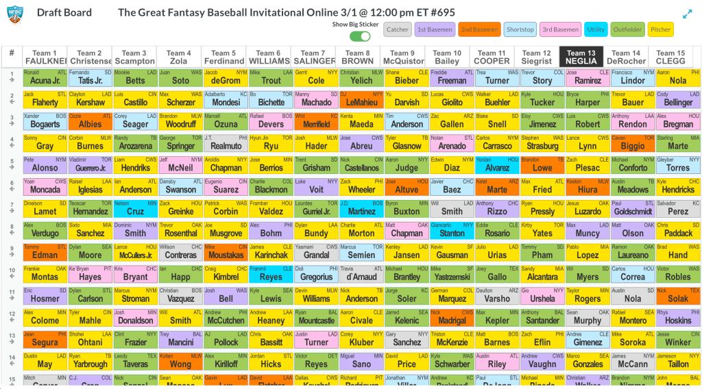 It went real nice, Steve, thanks for asking! But seriously, I had the 13th pick, so that was a little harsh, but can’t dwell on that. Being right near the turn, but not actually on the turn is kinda brutal (spoiler alert). I got sniped by Keaton DeRocher at least three times, and twice in a row, and that’s what makes this fun, right? We play this game for fun! So here we go…